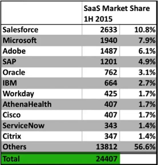 表1:2015年上半年SaaS厂商收入(单位:100万美元)来源:Wikibon 2015(参阅附录A的预测方法)