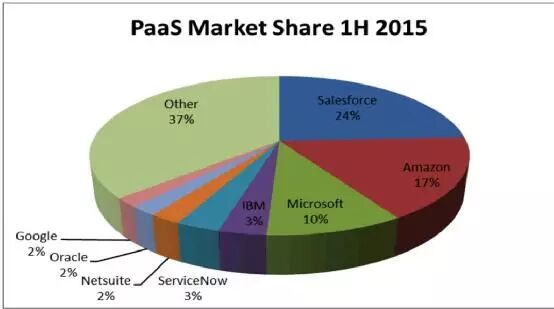 总的来说,Salesforce.com(24%)、亚马逊(17%)和微软(10%)是如今PaaS市场的三只领头羊。