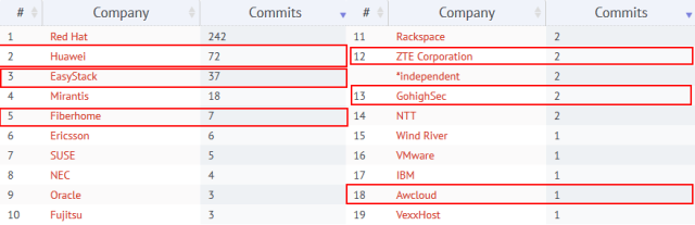 在最新的排名(TOP10)中从贡献上看,中国的华为(TOP2)、EasyStack(TOP7)、烽火通信(TOP8)三家公司跻身OpenStack社区核心代码贡献世界前十。详细列表如下: