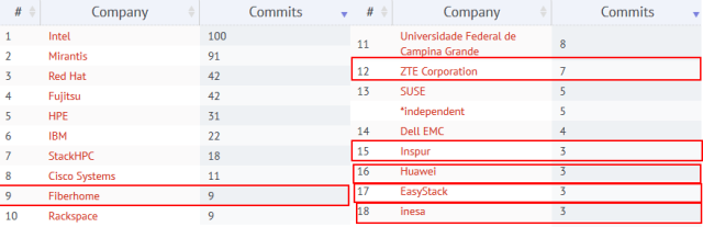 在Nova组件的贡献上,有1家中国企业进入了全球TOP10,那就是华为TOP2。另有3家中国企业进入了全球TOP20——EasyStackTOP11、烽火通信TOP13、浪潮TOP19。